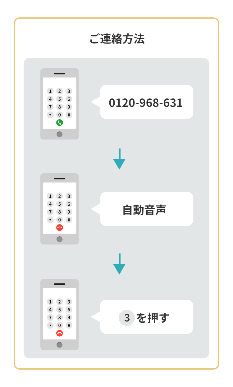 2025年12月1日(月)以降、新電話番号(0120-968-631)にお電話いただくと、自動音声のアナウンスが流れます。